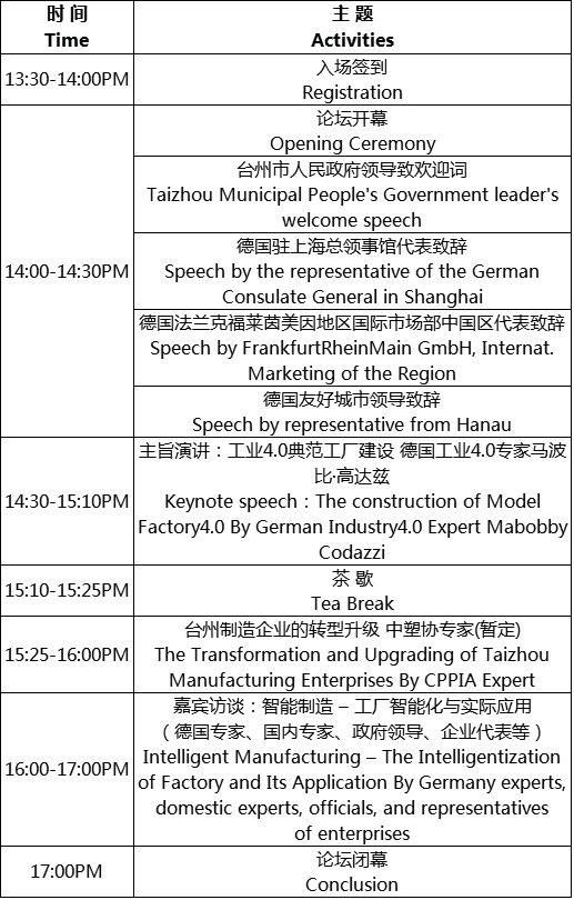 一帶一路合作共贏暨中德智能制造高峰論壇由臺州市人民政府主辦,臺州市倡議和創新驅動 發展戰略,解讀工業4.0與中國制造2025,集思廣益,探討中國制造業尤其是臺州制造 業的未來發展之路,加快推進智能制造發展和臺州制造業轉型升級,推動臺州“國際智 造名城”建設。